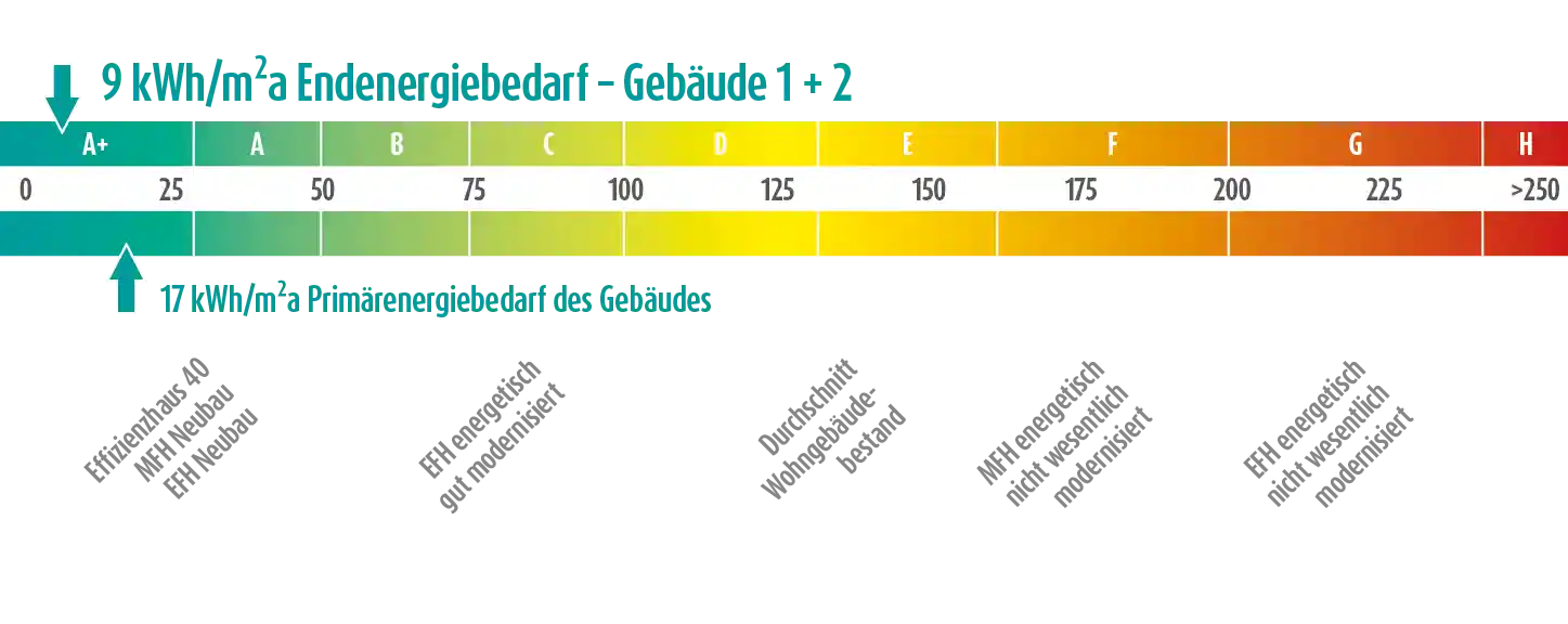 Dank modernster Gebäudetechnik – darunter eine hochdämmende Gebäudehülle, eine Photovoltaikanlage, eine Luft-Wärmepumpe und eine automatisierte Wohnraumlüftung mit Wärmerückgewinnung – reduzieren sich Ihre Nebenkosten spürbar. Bei den aktuellen Energiepreisen bedeutet dies für Sie langfristig erhebliche Ersparnisse. Die Bestnote der Energieeffizienzklasse A+ ist dabei Ihr Garant für niedrige Heizkosten und eine nachhaltige Wertsteigerung der Immobilie.