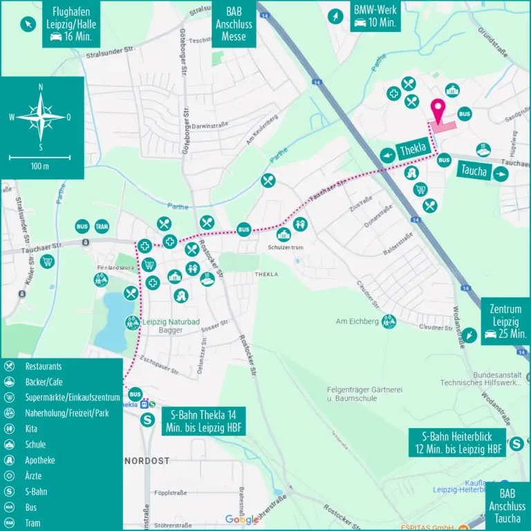 Und auch die Nähe zur Innenstadt muss nicht fehlen: Genießen Sie die exzellente Anbindung an den öffentlichen Nahverkehr. Nur rund 160 Meter vor Ihrer Haustür, befindet sich eine Bushaltestelle, die Ihnen Anschluss in alle Richtungen bietet. Von der S-Bahn-Station Thekla erreichen Sie den Leipziger Hauptbahnhof in nur 14 Minuten, von der S-Bahn Heiterblick in 12 Minuten und von der S-Bahn Taucha in 15 Minuten. So sind Sie jederzeit optimal mit der Leipziger Innenstadt und dem Umland verbunden.